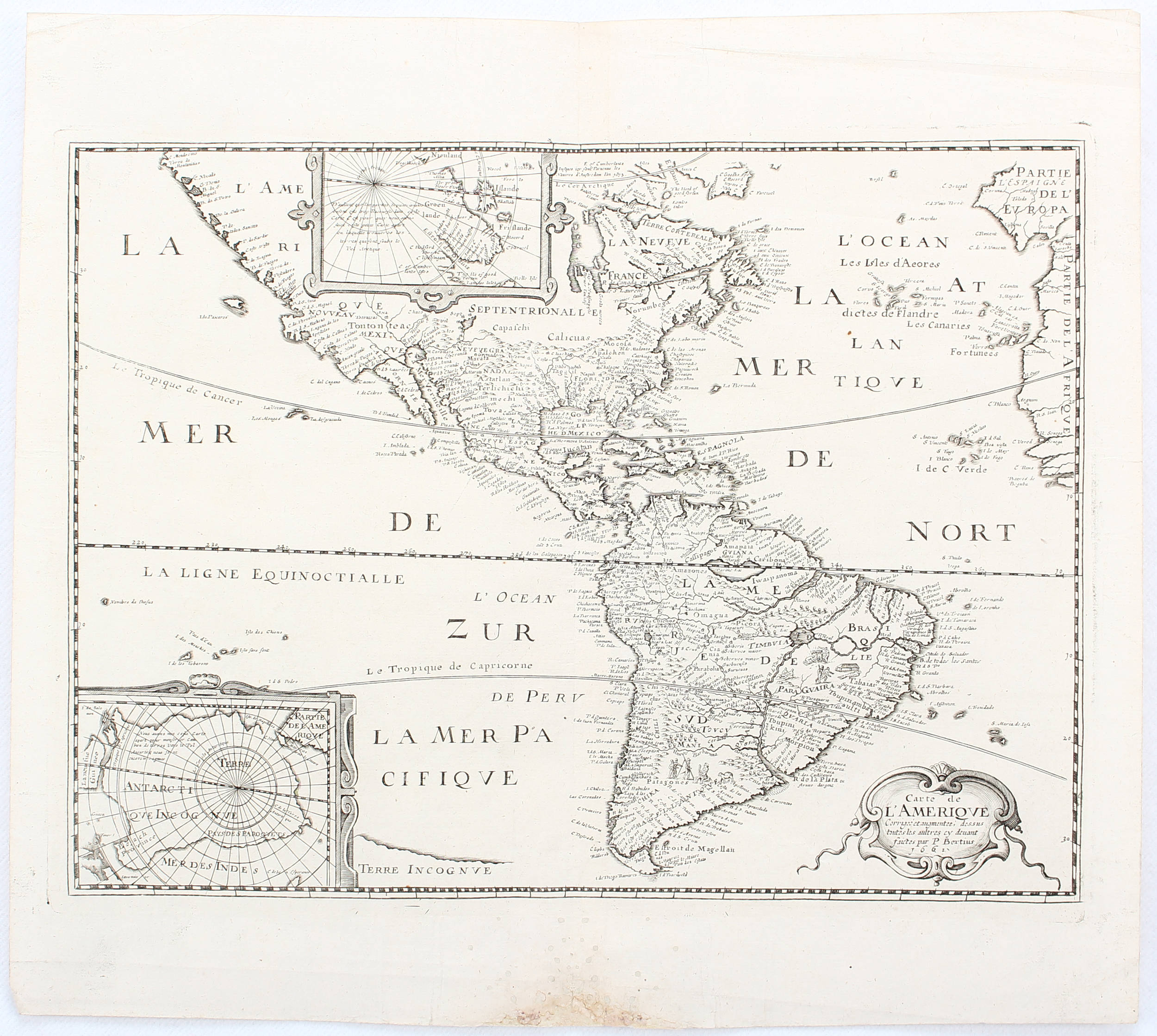 "Carte de l'Amerique". Kupf.-Kte. von P. Bertius (bei M. Tavernier, Paris), 1662. Mit 3 Rollwerkskart. mit Titel und 2 Nebenkarten sowie fig. Staffage (in Südamerika). 27:36,5 cm.