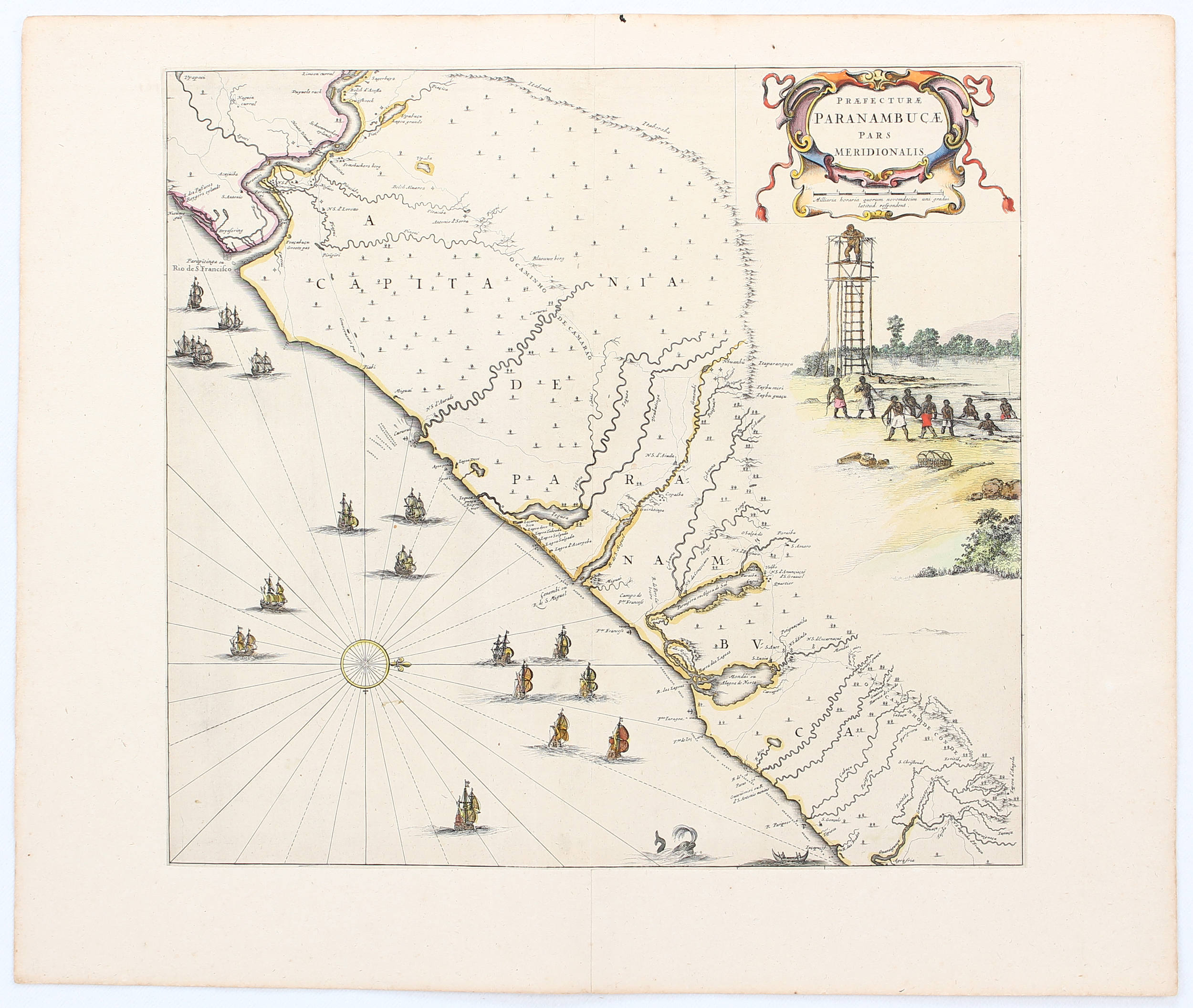 Brasilien. - Pernambuco. "Praefecturae Paranambucae pars meridionalis". Grenzkol. Kupf.-Kte. (von J. Blaeu), um 1660. Mit großer ausgem. fig. Kart. und reicher, kol. Schiffsstaffage. 41,5:44,5 cm.