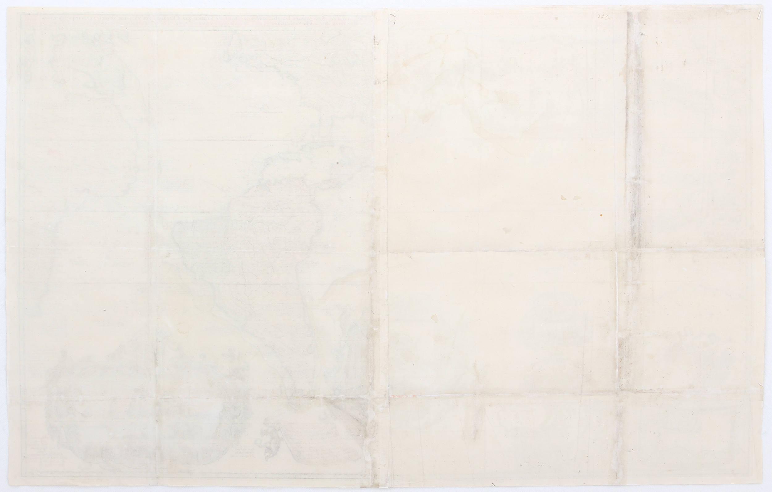McLaughlin/M., California 220.3 (von 3) mit Abb.; Tooley, California 94; ders., Australia 857: "Covers an area from West coast of Africa... to Australia... lettered Nouvelle Holland". - Seltene großformatige Karte des Gebietes zwischen Japan/Australien und dem westl. Europa/Afrika mit Amerika im Zentrum, basierend auf den großen Karten von N. de Fer 1713 bzw. Châtelain 1719. Hier im dritten und letzten Zustand mit Verlegeradresse und neuen Ausschmückungen, diese jeweils in fig. und ornamentalen Kartuschen: Pläne und Umgebungskarten bzw. Ansichten von Rio de Janeiro, Havanna, Mexiko, Panama, Portobelo, Vera Cruz, Gibraltar und dem Kap der Guten Hoffnung. - Sorgfältig restauriert: gereinigt und stabilisiert, stellenweise noch leicht fleckig; geplatzte alte Faltstellen und einige Randeinrisse sowie kl. Wurmlöcher hinterlegt.