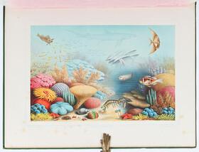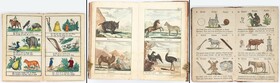 Bilderbogen. - Album mit 38 Bilderbogen. Meist I. M. Hermann, München, (um 1830?). Quer-fol. (32:39,5 cm). Mit zahlreichen kol. Lithographien auf 19 Kartonbll. beidseitig aufgezogen. Hprgt. d. Zt. mit Vorsätzen aus in Schablonentechnik gefertigter Tapetenbahn; angestaubt, bestoßen, etwas berieben.