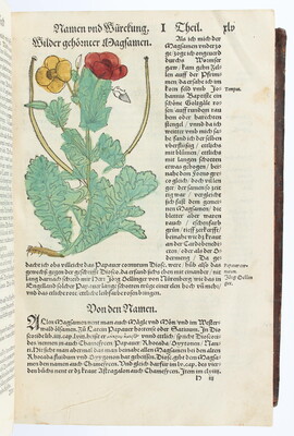 (Bock, H. Kreuter Buch. Darinn Underscheidt, Namen unnd Würckung der Kreütter, Stauden, Hecken und Beimen, sampt iren Früchten, so inn Teutschen Landen wachsen. Von newem fleissig ubersehen, gebessert und gemehret). Straßburg, J. Rihel, 1560. Fol. (34,5:22,5 cm). Mit altkol. Holzschn.-Porträt u. über 500 altkolorierten Pflanzenholzschnitten von D. Kandel u. a. 15 (statt 19 Bll. u. ohne 1 w. Bl.); 413 röm. num., 7 nn. Bll. Spät. Ldr., beschabt, neu aufgebunden, Rücken u. Vorsätze erneuert.