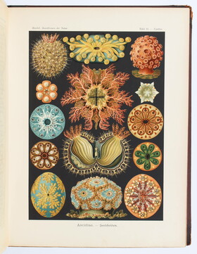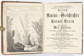 Ellis, J. Versuch einer Natur-Geschichte der Corall-Arten und anderer dergleichen Mer-Cörper, welche gemeiniglich an den Küsten von Groß-Britannien und Irrland gefunden werden. Nebst einer Beschreibung eines großen Büschel-Polypen, welcher in dem Eis-Mere gefangen worden. Aus dem Englischen und Französischen übersetzt und mit Anmerkungen begleitet von J. G. Krüniz. Nürnberg, Raspe, 1767. 4to (25:21 cm). Mit gest. Frontispiz und 46 teilw. gefalt. Kupfertafeln. 52, 168 S. Hldr. d. Zt. mit goldgepr. Rsch. u. goldgepr. Deckelfileten; etwas berieben, Ecken u. Kanten bestoßen.