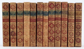Buffon, G. L. L. de. Naturgeschichte der Vögel. Bd. 1-27 in 27 Bdn. Brünn u. Troppau, J. G. Trassler (Bd. 1-8) sowie Wien, F. A. Schrämbl (Bd. 9-27), 1786-1803. (17:11 cm). Mit 1253 kol. Kupfertafeln. Hldr. d. Zt. mit goldgepr. Rsch., berieben u. mit einigen bestoßenen Ecken; Rücken häufig mit kl. Wurmlöchern, Bd. 27 stärker.
