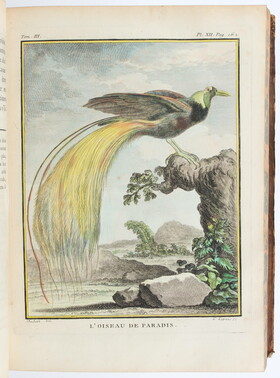 Buffon, G. L. L. de. Histoire naturelle des oiseaux. 9 Bde. Paris 1770-1783. 4to (26,5:21 cm). Mit 9 (7 kol.) gest. Titelvignetten, 9 (7 kol.) gest. Kopfvign. u. 262 kol. Kupfertafeln. Ldr. d. Zt. mit Rvg. u. 2 Rsch.; etwas betoßen, Kapitale teilw. abgestoßen, einige Gelenke mit Einrissen und Fehlstellen, Deckel von Bd. 1 mit Schabstellen u. kl. Ausrissen, Rsch. von Bd. 4 ergänzt.