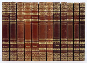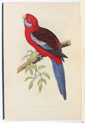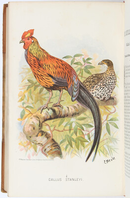 Nissen, IVB 267; Anker 120; Fine Bird Books 92; Zimmer 177; Martin Libr. 78. - Komplettes Exemplar der monumentalen Prachtpublikation. "A very thorough manual of the subject, beautifully illustrated by J. G. Keulemans, Josef Wolf, E. Neale and others" (Zimmer). Hier mit dem oft fehlenden Supplementband, der erst 1895/96 erschien. "Dresser's collection of twelve thousand bird skins was used by Keulemans and the other artists" (Martin Libr.). Die Tafeln zeigen meist Vogelpärchen in Gezweig oder Landschaft in detaillierten, naturgetreuen Darstellungen. Prächtig koloriert, tlw. mit Eiweiß gehöht. Paginierung und Tafelnum. hier sauber eingestempelt, die Tafeln num. 1-722 u. 599A. - Breitrandiges Exemplar (Textbll. z.T. unten über die Tafeln etwas hinausgehend). Teilweise stockfleckig, meist im Rand, Titeleien etwas stärker; Bd. 9 im Tafelrand vereinzelt fleckig. Mit Wappen-Exlibris der "Library of the Royal Artillery Institution".