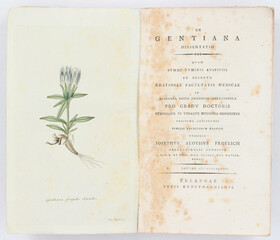 Stafleu-C. 1906; vgl. Pritzel 3131 (Handelsausgabe). - Erste Ausgabe dieser wichtigen Dissertation über den Enzian. Wohl eine der frühesten Monographien über den Enzian mit Beschreibung von 47 Arten. Die Tafel zeigt "Gentiana frigida Haenke" von Jacob Sturm. - Etwas stockfleckig, Titel stärker. Ecken etwas geknickt. Vorsatz mit Widmung des Verfassers.