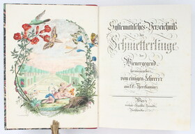 (Denis, M., u. a.). Systematisches Verzeichnis der Schmetterlinge der Wienergegend, hrsg. von einigen Lehrern am k. k. Theresianum (d. i. M. Denis, I. Schiffermiller u. A. von u. zu Goldegg u. Lindenburg). Wien, Bernardi, 1776. 4to (28:22 cm). Mit gest. Titel, kol. gest. Frontispiz, 2 kol. Kupfertafeln u. 1 gest. Schlussvignette. 322 S., 1 Bl. Neuerer rotbrauner Hldr. mit goldgepr. Rtitel u. Rückenfileten.