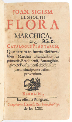 Elsholtz, J. S. Flora Marchica, sive catalogus plantarum, quae partim in hortis electoralibus Marchiae Brandenburgicae excoluntur. Berlin, Runge für Reichel, 1663. (16:10 cm). 2 Bll., 223 S., 7 Bll. (inkl. Errata). - Angebunden: J. L. Bausch. Schediasmata bina curiosa de lapide haematite et aetite. 2 Tle. in 1 Bd. Breslau, Hahn für Trescher in Leipzig, 1665. Mit 6 (statt 7, davon 2 doppelblattgr. gefalt.) Kupfertafeln. 2 Bll., 164 S.; 4 Bll., 79 S. Prgt. d. Zt. mit spanischen Kanten u. hs. Rtitel., etwas angestaubt, Rücken mit kl. Falte.