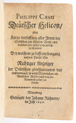 Zesen, P. v. Deutscher Helicon, oder Kurtze verfassung aller Arten der jetzt üblichen Verse, wie dieselben ohne Fehler recht zierlich zu schreiben. Wittenberg, J. Röhner, 1640. (16:10,5 cm). 88 Bll. - Angebunden: Ders. Deutsches Helicons Ander Theil, darinnen begriffen allerley Arten und Muster der deutschen Getichte. Ebda. 1641. 8 Bll., 170 S., 27 Bll. - Sven Aggesen. Quae extant opuscula. Stephanus Johannis Stephanius ex vetustissimo codice membrano. Sorø, H. Kruse, 1642. 8 Bll., 223 S. Prgt. d. Zt. mit spanischen Kanten, hintere Vorsätze mit Wurmspuren.