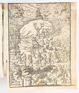 Fragment of the first German edition. With 506 (of 517; 504 full-page) woodcuts in text. Lacking title replaced by a calligraphed title. - Somewhat browned and heavily stained, partly marginal dampstaining, first sheet heavily soiled, here and there creases, a few old ink notes, wormhole to center of 4 sheets (with small text and image losses). With numerous repairs throughout (some extending into the image or text; some rep. using adhesive tape), first and last sheets. particularly badly affected; p2 with a large tear-out, therefore only half of illustration 104 present, 1 woodcut colored in pencil, front. free endpaper with 20th century note on the provenance. Lacking: Title with printer's device and verso portrait of the author, 1 index leaf, 10 leaves (m4, Bb4, Ll1, BB1-6, CC1) with a total of 11 woodcuts and the portraits of the 3 illustrators as well as the final leaf (CC2) with 2nd printer's device. Bound in 19th century half-calf, rubbed and stained, tear-offs to head and tail of spine. Sold Waf.