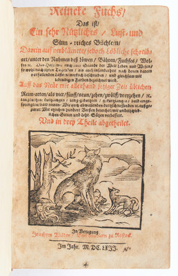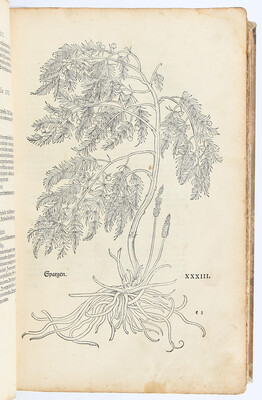 VD 16, F 3243; Nissen, BBI 659; Stafleu-C. 1910; vgl. Horblit 33b, Sparrow 72, Dibner 19 u. Garrison-M. 1808 (alle lat. EA. von 1542). - Fragment der ersten deutschen Ausgabe des berühmtesten Kräuterbuchs der Renaissance. Die Holzschnitte schuf V. R. Speckle nach Entwürfen der Maler H. Füllmaurer und A. Meyer. In der Nummerierung der Holzschnitte ist die Nr. 100 übersprungen. Das fehlende Titelblatt vorliegend durch einen kalligraphierten Titel ersetzt. - Etwas gebräunt u. stärker fleckig, Ränder teils auch wasserfleckig, erstes Bl. stark angestaubt; hier u. da Knitter- oder Knickfalten, vereinzelt alte hs. Amerkungen, 4 Bll. mit Wurmgang mittig (mit kl. Text- u. Bildverlusten). Durchgehend mit zahlreichen Reparaturen (etliche bis in das Bild bzw. den Text; teilw. mit Klebeband), erste u. letzte Bll. besonders stark betroffen. Bl. p2 mit gr. Ausriss bis zur Blattmitte, daher Illustration 104 nur zur Hälfte vorhanden u. verso Textverlust, 1 Holzschnitt in Bleistift ausgemalt, vord. freies Vorsatz mit Kugelschreibernotiz des 20. Jh. zur Provenienz. Fehlen: Titel mit Druckermarke u. verso dem ganzs. Porträt des Autors, 1 Registerbll., 10 Bll. (m4, Bb4, Ll1, BB1-6, CC1) mit zusammen 11 Pflanzenholzschnitten und dem Dreierporträt der Illustratoren sowie das letzte Bl. (CC2) mit der 2. Druckermarke. oRR.