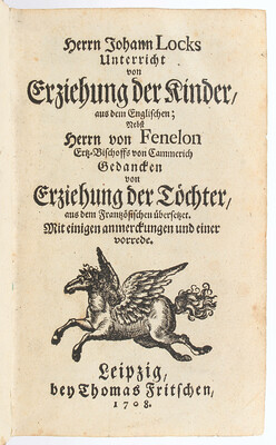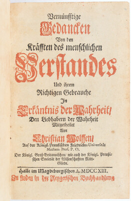 Wolff, C. Vernünfftige Gedancken von den Kräfften des menschlichen Verstandes und ihrem Richtigen Gebrauche in Erkäntnis der Wahrheit, den Liebhabern der Wahrheit mitgetheilt. Halle, Renger, 1713. (17,5:11 cm). 8 Bll., 167 S., 12 Bll. Ldr. d. Zt. mit schöner Rvg.; etwas berieben, Rücken u. Außengelenke mit kl. Wurmlöchern, Vorsätze u. vorderes Innengelenk mit Wurmspuren.