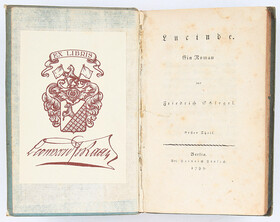 Goed. XII, 64, 9. - Erste Ausgabe, sehr selten. "In beiden Hälften bedeutsame Äußerungen über d'Alambert, Fielding, Herder, Horaz, Lavater, Lessing, Rousseau, Schiller, Sterne, Swift, Voltaire..." (Goed.) u.v.a. Bd. 1, S. 172 u. Bd. 2, S. 44 wird auch J. M. R. Lenz erwähnt. - Leicht gebräunt, teilw. etwas stockfleckig, beide Titel beidseitig mit Stempel. Vorderes freies Vorsatz jeweils mit Besitzvermerk "Dr. Franz Becker. 1822".