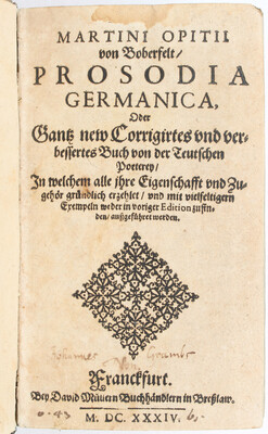I. VD 17 39:142236D (nur Erfurt u. Göttingen, Leipzig inkomplett); Goed. III, 20, 6a (ausführlich) u. 98, 3a; Dünnhaupt 4278, 6.1. - Erste Ausgabe, sehr selten und in dieser Ausgabe in einem Band komplett. "Erstdruck von Z's einflußreicher Poetik mit Reimlexikon" (D.). - II. VD 17 12:130769Q; Goed. III, 21, 6b u. 98 3b; Dünnhaupt 4278, 6.1. - Bd. 2 der wesentlich erweiterten Neufassung, "in Tl. II fast ausschließlich poet. Beispiele (Gedichte, Oden u. Lieder), darunter S. 97-142 der Erstdruck von 'Salomons ... Hohes Lied'. - III. Bruun, Bibl. Danica III, 9; Thesaurus libr. Danicorum II, 308. - Erste Ausgabe der Werke des dänischen Geschichtsschreibers Sven Aggesen (gest. nach 1186). - (I-II) gebräunt; (III) am Ende mit wenigen Wurmlöchern.