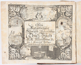 VD 18 11634030; Nissen, ZBI 1074; Horn-Sch. 19276. - Einzige Ausgabe. "Eine vielgesuchte Seltenheit" (Nissen II, 150). Mit prächtigem Rokoko-Frontispiz. Die beiden Kupertafeln zu einem Blatt zusammengefügt. - Schönes, kaum fleckiges Exemplar auf starkem Papier. Frontispiz mit leicht oxydiertem Bleiweiß.