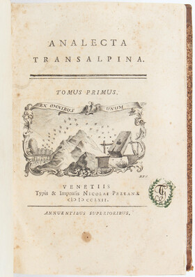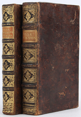 Crüger, J. E. (Hrsg.) Analecta transalpina. (Epitome commentariorum Regiae Scientiarum Academiae Suevicae pro annis 1739-1746. Svecico idiomate conscriptorum, sive analectorum transalpinorum). 2 Bde. Venedig, N. Pezzana, 1762. (20:13,5 cm). Mit 2 (wdh.) gest. Titelvignetten, 1 gest. Textvignette u. 24 gefalt. Kupfertafeln. XXXII, 511 S.; 4 Bll., 527 S. Attraktive Hldr. d. Zt. mit Rvg. u. je 2 farb. Rsch., leicht berieben.