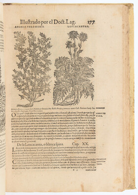 Dioscorides, P. Acerca de la materia medicinal y los venenos mortiferos. Trad. de lengua Griega en la vulgar Castellana y con annotationes por Andres de Luguna. Salamanca, M. Gast, 1570. Fol. (31:21 cm). Mit Holzschn.-Wappen, Holzschn.-Porträt u. ca. 1000 Textholzschn. 28 Bll., 616 S. Alter Prgt. mit Rsch. u. etwas Rvg.; Vorsätze alt erneuert, etwas fleckig u. gering bestoßen, Kanten u. Rücken mit kl. Bezugsfehlstellen, Buchblock vor dem hinteren Vorsatz angebrochen, hinteres Außengelenk mit einzelnem Wurmloch.