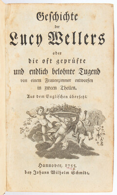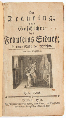 Der Trauring; oder Geschichte des Fräuleins Sidney; in einer Reihe von Briefen. Aus dem Englischen (von C. A. Wichmann). 3 Bde. Breslau, Korn d. Ä., 1780. Mit 3 gest. Titelvignetten von Rosmäsler. 4 Bll., 176 S.; 196 S.; 188 S. Spätere Umschl.; gebraucht.