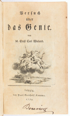 VD 18 1139997X. - Erste Ausgabe. Wieland war Professor der Philosophie in Leipzig. In der vorliegenden seltenen Untersuchung versucht er, die Natur und die Grenzen, den Ursprung und die Ausbildung des Genies zu definieren. - Gebräunt u. vereinzelt etwas fleckig; erstes Bl. der Vorrede mit kl. Loch im Rand. Titel mit altem Namenszug "Bouvier".