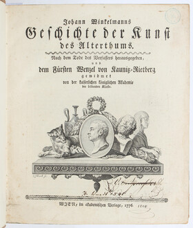 Winckelmann, J. J. Geschichte der Kunst des Alterthums. Nach dem Tode des Verfassers herausgegeben ... von der kaiserlichen königlichen Akademie der bildenden Künste. (Mit Vorrede von F. J. Reichel). 2 Bde. Wien, Akademischer Verlag, 1776. 4to (24,5:22 cm). Mit 2 gest. Titel- u. 20 gest. Textkupfern. 6 Bll., LXXII, 618 S.; 1 Bl., S. (619)-881, 28 Bll. Ldr d. 19 Jh. mit 2 farb. Rsch. u. Rvg.; vereinzelt leicht beschabt, Vorderdeckel von Bd. 1 mit kl. Bezugsfehlstelle.