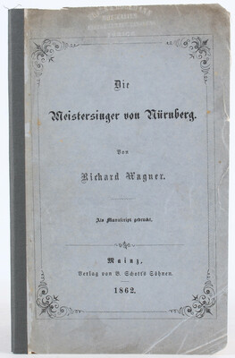 WWV 96, X (nur 8 Ex. nachgewiesen); Klein, Wagner S. 35f. - Sehr seltener Erstdruck des Textbuchs, war sechs Jahre vor der Uraufführung der Oper (München, 21. Juni 1868) erschienen. "Auf S. 101 ist noch die erste Textfassung abgedruckt, wie sie Richard Wagner mit seinem eigenhändigen Textbuch an den Setzer weitergegeben hat" (Klein). - Wohlerhalten.