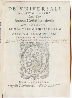 EDIT 16, CNCE 13637; Hunt 131; Pritzel 1921. - Erste Ausgabe. Selten im Handel. Giovanni Costeo (1528-1603) war Arzt u. Botaniker in der Nachfolge des Theophrast, ab 1570 Professor für Medizin in Turin. In vorliegendem Werk untersucht er das Wesen der Pflanzen, unterscheidet dabei nach Kriterien wie Geruch, Geschmack, Farben, Textur, Fasern im Holz u. in den Blättern, aber auch hinsichtlich Krankheiten, benötigten Nährstoffen etc. und behandelt zudem die Seele der Pflanzen. - Titel mit altem hs. Besitzvermerk, gering angestaubt u. mit ergänztem Stempelausschnitt mit fachmännisch ersetztem Text. - Provenienz: aus der Bibliothek der Emma Radio von Radiis Pantolska mit dem von dem Designer Rudolf von Larisch gestalteten Exlibris auf dem Innendeckel.