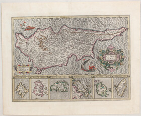 Cypern. "Cyprus Ins:". Karte der Insel (24,5:50 cm), darunter Leiste mit 6 kl. Karten griech. Inseln (Chios, Rhodos etc.). Altkol. Kupferstich (aus Mercator-Hondius, französ. Ausgabe 1628 oder 1633). Mit 2 ausgem. Rollwerkskartuschen und kol. maritimer Staffage. 35:49 cm.