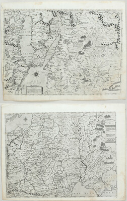 Very rare and fine map(s) of Eastern Europe after Gastaldi-Licinio; depicting Poland, parts of Russia (including Crimea), Gulfs of Bothnia and Finland. "The present adoption by Paolo Forlani draws on the topographical details very closely. The main difference is the engraving in the form of two sheets with separate titles for each. Although they form a matching pair, it is difficult to join the two sheets together" (M.). - 2 sheets, not joined; uncol. Somewhat toned; light spotting in places, some waterstaining to lower right image corners; both sheets cut just into neatline at top and remargined. 1. Cut into neatline at bottom left. 2. Small repaired tear at lower right just affecting image.