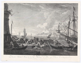 Ansicht mit Blick über die Bucht auf den rauchenden Vesuv, im Vordergrund fig. Staffage, Fischerboote und Segelschiffe. - Leicht gebräunt bzw. angestaubt. Ränder mit kl. rep. Läsuren, kl. Knickfalte oben.