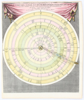 Italien. - Volvelle. "Discus chronologicus regum utriusque Siciliae et Ducum principumque Italiae praecipuorum". Darst. im Rund mit Auflistung der italien. Herrscher vom 11. Jh. an. Altkol. Kupf. von C. Weigel, um 1725. Mit beweglichem Zeiger und ausgem. Vorhangkart. oberhalb. Plattengröße 43:36 cm.