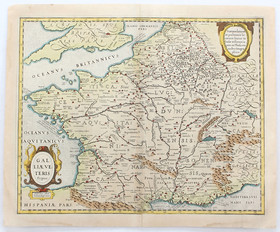Frankreich. "Galliae veteris Typus". Kol. Kupf.-Kte. bei J. Janssonius. Mit 2 ausgem. Rollwerkskart. 39,5:49 cm.