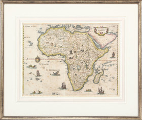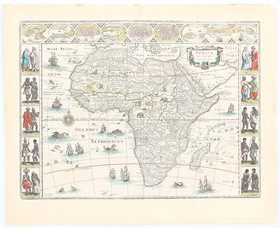 "Africae nova descriptio". Altkol. Kupf.-Kte. von W. Blaeu. Mit ausgem. floraler Kart. und reicher kol. fig. und maritimer Staffage; eingefasst von 3 kol. Bildleisten: seitl. je 5 Eingeborenenpaare, oben 9 kl. Ansichten, darunter Algier, Tunis und Kairo. 41:55 cm.