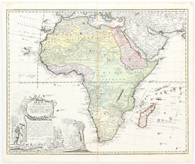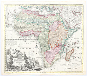 "Africa". Altkol. Kupf.-Kte. von M. Seutter, um 1730; gest. von G. Rogg. Mit großer fig. Kart. 49,5:57,5 cm.