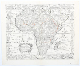 "A New and most exact Map of Africa. Described by N. I. Vischer and don into English, enlarged and corrected, according to I. Blaeu". Grenzkol. Kupf.-Kte. von J. Overton, London, um 1670. Mit ornament. Kart., kl. Tier- und maritimer Staffage sowie eingefasst von 4 Bildleisten mit insges. 8 Abb. von Ureinwohnern, 6 Medaillonporträts afrikanischer Herrscher und 9 Ansichten im Oval. 42:52 cm.