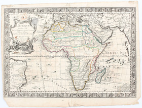 "L'Afrique". Grenzkol. Kupf.-Kte. von (J. Luillier) bei G. Danet, Paris, 1732. Mit fig. Kart.; eingefasst von mit Muschelwerk verzierten Wappenleisten. 48,5:71 cm.