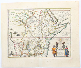 Zentralafrika. "Abissinorum sive Pretiosi Ioannis Imperiu(m)". Kol. Kupf.-Kte. (von J. Hondius aus Mercator-Hondius, französ. Ausg., 1628/33). Mit 3 ausgem. Rollwerkskart., davon 1 mit kol. Nebenkarte: "Congi Regni". 34:49 cm.