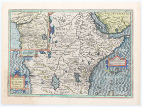 Zentralafrika. "Presbiteri Johannis, sive, Abissinorum Imperii descriptio". Kupf.-Kte. (aus A. Ortelius). Mit 2 Rollwerkskart., maritimer und Tierstaffage. 37:43,5 cm.