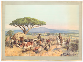 Namibia. - Windhuk. "Auf der Steppe bei Windhoek". Vorbeiziehender Treck mit Schutztruppe, Schafen und Ochsen an einer Eingeborenenhütte mit Fernblick auf die Stadt. - Dazu: "Am Waterberge". Schutztruppler an einer Wasserstelle. - Zus. 2 Bll. Chromolith. nach R. Hellgrewe hrsg. von A. Wünsche bei Leutert & Schneidewind, Dresden, um 1910. Je 70:100 cm.