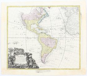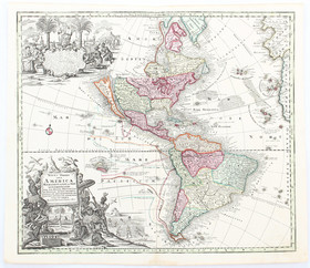 "Americae tam septentrionalis quam meridionalis in mappa geographica delineatio". Grenzkol. Kupf.-Kte. von A. F. Zürner bei P. Schenk, um 1710. Mit 2 großen fig. Kart. 50:58 cm.