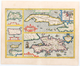 Kuba. Übereinanderliegende Karten von Kuba und Haiti, links kleinere Karten von Jamaica, Puerto Rico und Margarita. Kol. Kupf. (von J. Hondius aus Mercator-Hondius). Mit zusammen 8 ausgem. Rollwerkskart., oben rechts kl. kol. Plan von Havanna. 35:49 cm.