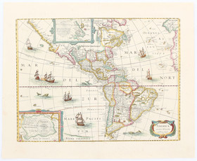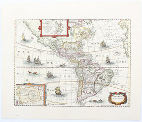 "America noviter delineata". Kol. Kupf.-Kte. von J. Janssonius, um 1650. Mit ausgem. Kart., 2 farb. kl. Pol-Karten sowie reicher Indianer- und Schiffsstaffage. 37,5:50 cm.