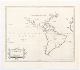 "Carte de l'Amerique". Kupf.-Kte. von P. Bertius (bei M. Tavernier, Paris), 1662. Mit 3 Rollwerkskart. mit Titel und 2 Nebenkarten sowie fig. Staffage (in Südamerika). 27:36,5 cm.
