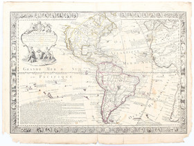 "Carte d'Amerique, divisées en ses principales parties". Kol. Kupf.-Kte. von G. Delisle, verbessert nach d'Anville u.a. bei Covens & Mortier & Covens Junior, Amsterdam, 1774. Mit 2 ausgem. ornament Kart. 49:59,5 cm, darüber latein. Titel.