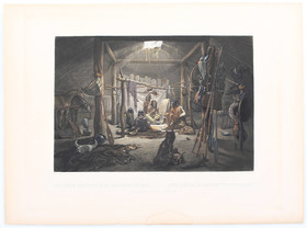 - Taf. 19: "The Interior of the Hut of a Mandan Chief", mit Gerätschaften und Waffen sowie auch Hunden und Pferden. Gest. von Desmadryl. Bildgröße 28:41 cm.