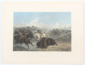 Bodmer. Kol. Aquatintatafeln mit Abb. von nordamerikan. Indianern (als Porträts oder bei Tätigkeiten) und Landschaften nach C. Bodmer (Stecher jeweils einzeln angegeben) aus der großartigen Reisebeschreibung von Nordamerika des Maximilian Prinz zu Wied-Neuwied. Die Tafeln wurden gedruckt bei Bougeard, um 1840, für die 3 Hrsg. der dt., engl. und französ. Ausg., Hölscher, Ackerman und Bertrand. Sie haben meist die Künstler- und Verlegeradressen sowie Trockenstempel und dreisprach. Titel; Abweichungen jeweils angegeben.