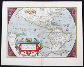 "Americae sive novi orbis, nova descriptio". Kol. Kupf.-Kte. von A. Ortelius, 1587. Mit 2 ausgem. Rollwerkskart., reicher farb. Schiffsstaffage und kol. ornament. Verzierungen in den Ecken. 35,5:48 cm.