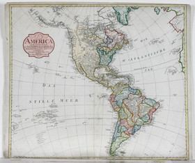 "America nach der zweyten Ausgabe von Arrowsmiths Weltcharte". Kol. Kupf.-Kte. von C. Mannert bei A. G. Schneider und Weigel, Nürnberg, 1796. Mit ausgem. ornament. Kart. 52,5:59,5 cm.