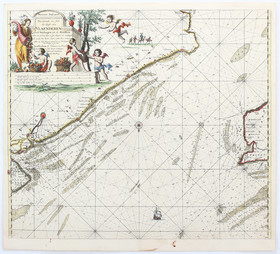 Koeman IV, S. 393/69. - Südl. orientierte Karte der Küste von Flandern mit den Gebieten zwischen Middelburgh, Calais und Dover, Dünkirchen im Zentrum; frühe Ausgabe noch ohne "De Hoofden". - Gereinigt und stabilisiert, stellenweise noch leicht fleckig. Einige kl. Wurmlöcher hinterlegt; unten bis knapp in den Bildrand beschnitten (unter Verlust der Num. 9 rechts) und angerändert, Einfassung nachgezeichnet, ferner oben kl. Randläsuren.