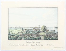 Berlin. "Berlin von Treptow aus gesehen". Blick über die Spree, im Vordergrund Gewächshäuser und Gasthof mit Aussichtsterrasse. Kol. Umrissrad. von (H.) Hin(t)ze bei G. E. Müller, um 1840. 28,5:44 cm, mit schwarzem Tuschrand; unterhalb der Titel und Widmung an "Wilhelm Friedrich Carl der Niederlande".