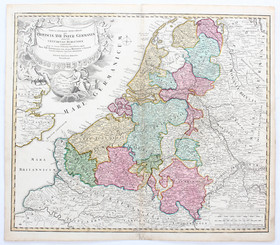 Niederlande und Belgien. "Novißima et accuratißima XVII Provinciarum Inferioris Germaniae tabula". Bei D. Funck, Nürnberg, um 1695; gest. von J. B. Homann. Mit 2 figürlichen Kartuschen. 48:56 cm.